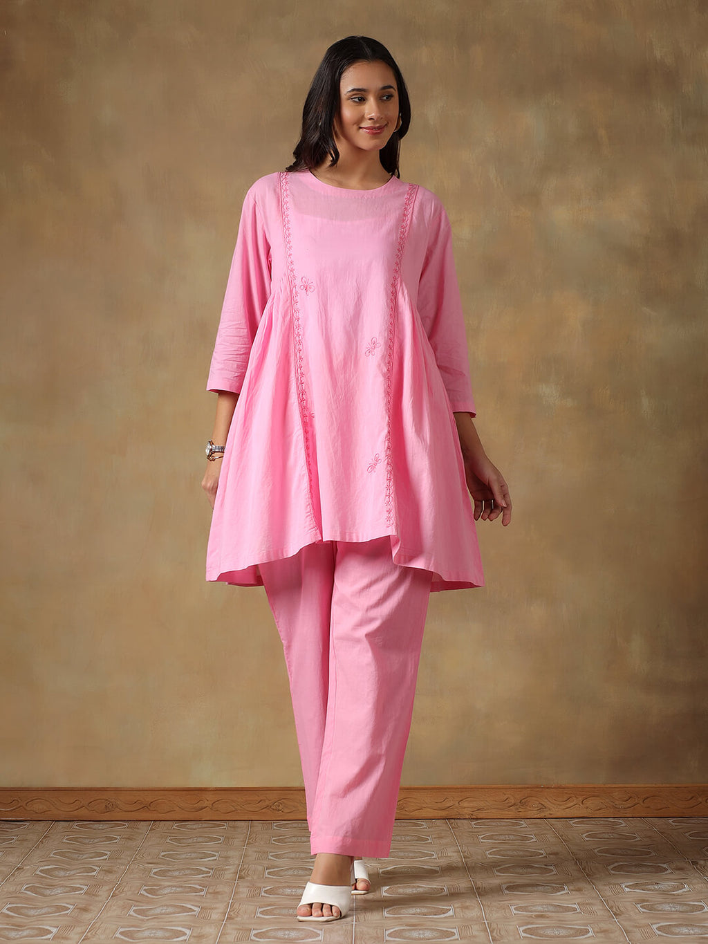 This co-ord set features a flowy cotton kurta paired with classic straight-fit pants, making it ideal for everyday wear, office dressing, travel, and summer outings. Subtle hand-embroidered Chikankari motifs enhance the kurta, adding artisanal charm while maintaining a contemporary silhouette.