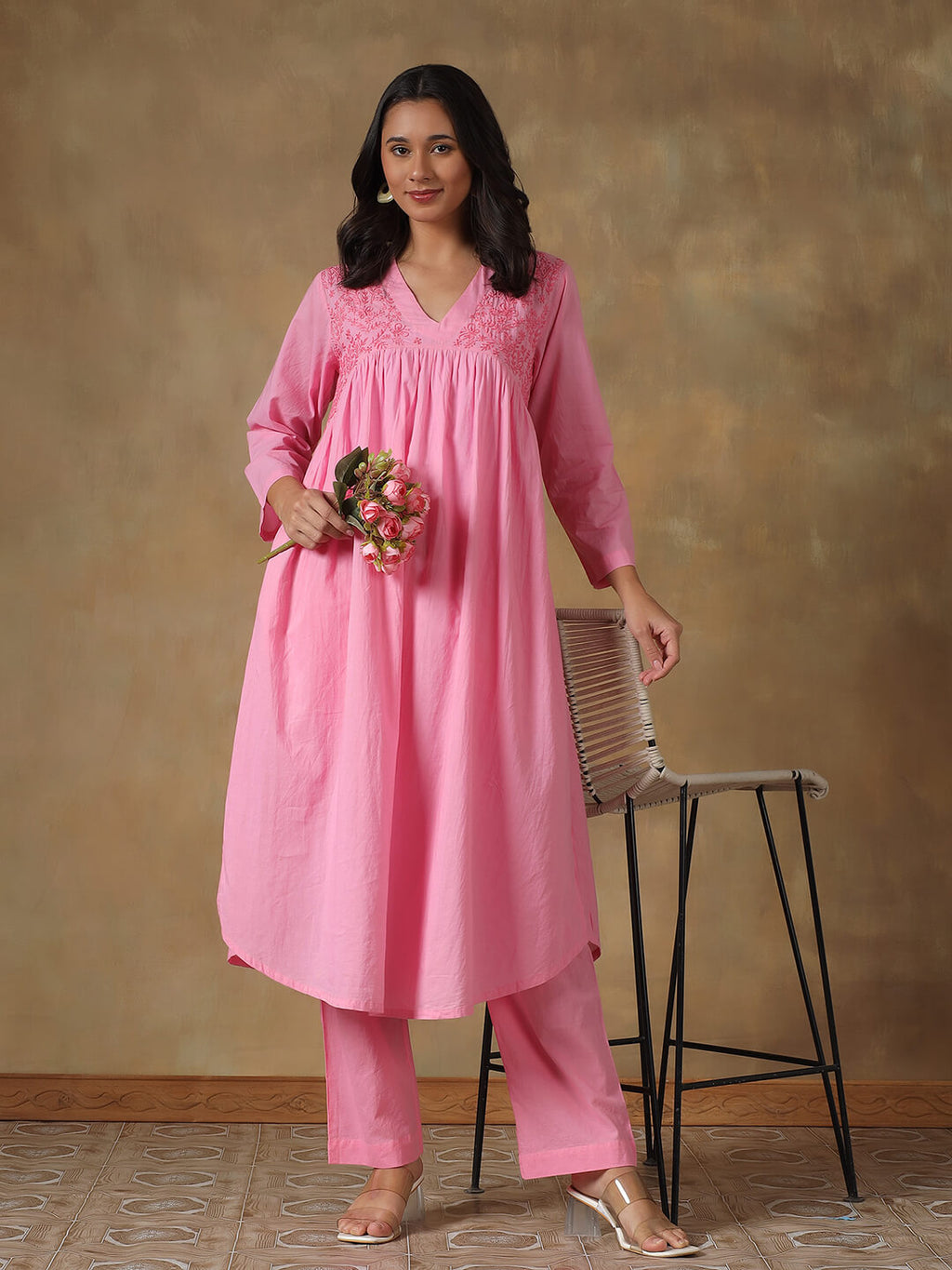 Pink Cotton Chikankari Lucknowi Kurta-Pant Set