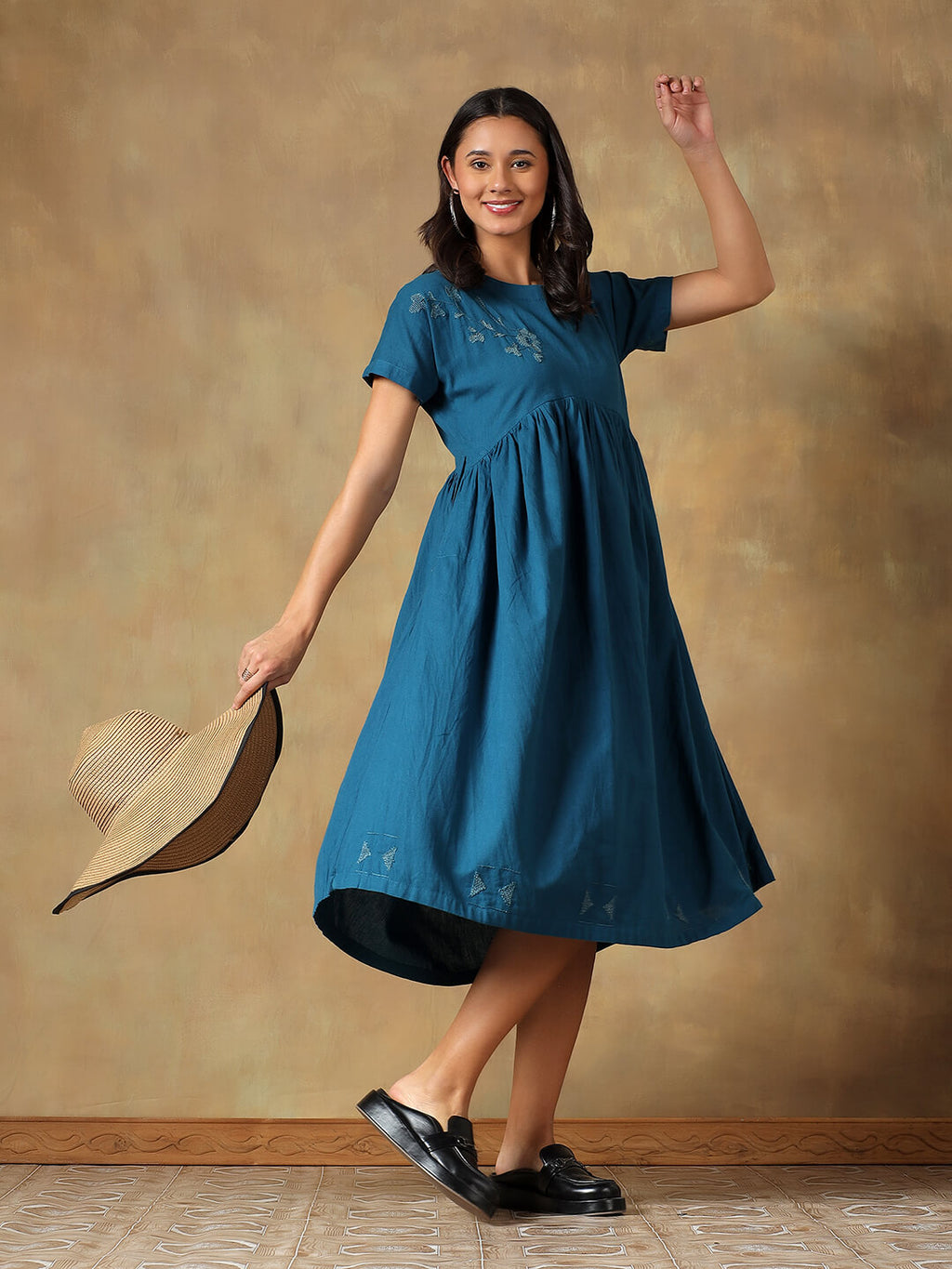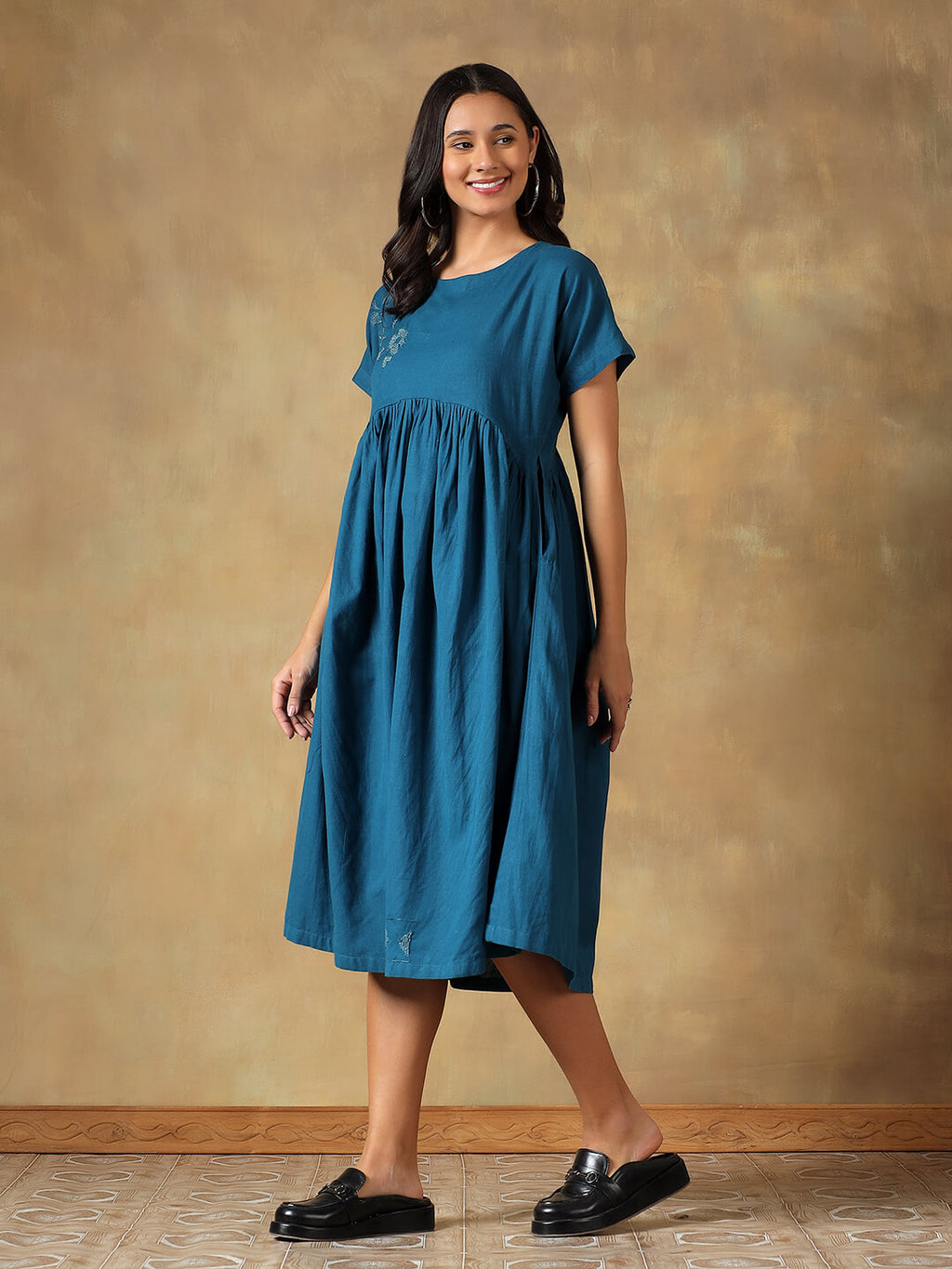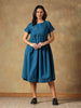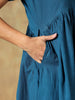 Crafted in breathable cotton, this Teal Cotton Chikankari Dress is designed for effortless everyday comfort. Featuring a relaxed silhouette with an empire waist and soft gathers, it offers a fluid, airy fit. Delicate hand-embroidered Chikankari, inspired by jamdani motifs add subtle elegance, while short sleeves and functional side pockets make it ideal for warm weather, long days, and travel.