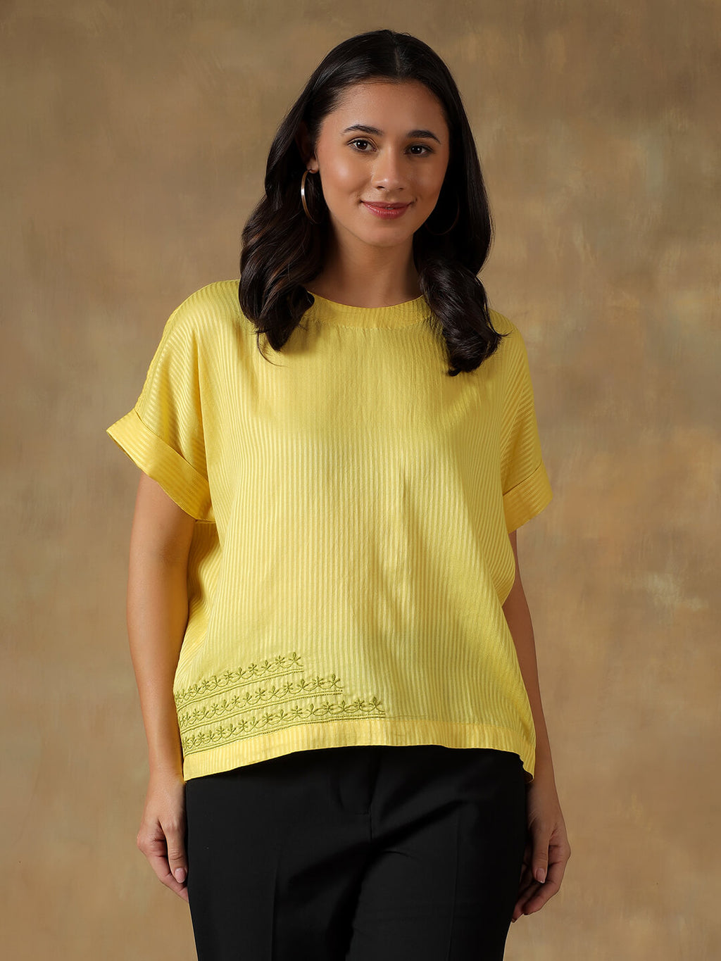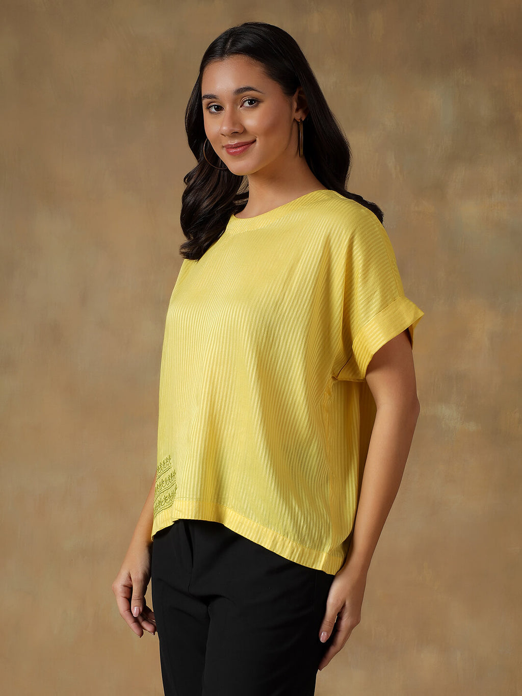 Crafted from breathable self-striped cotton, this Chikankari Top offers effortless comfort with a relaxed silhouette. Delicate hand-embroidered Chikankari detailing along the hem and back adds a subtle artisanal touch. Featuring short sleeves and an easy fit, it’s perfect for casual days, summer outings, and travel-ready styling.