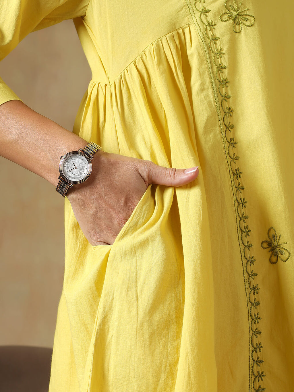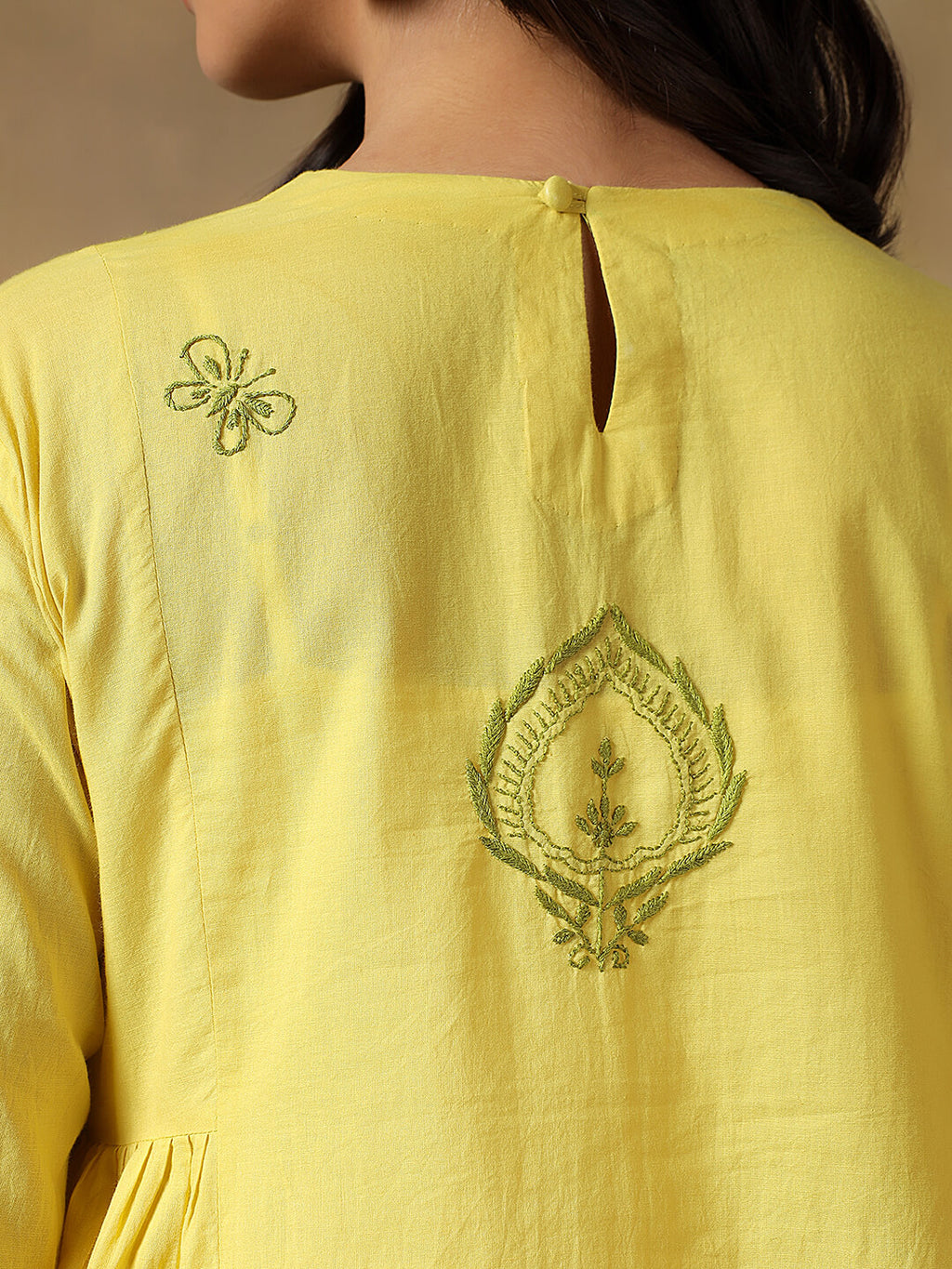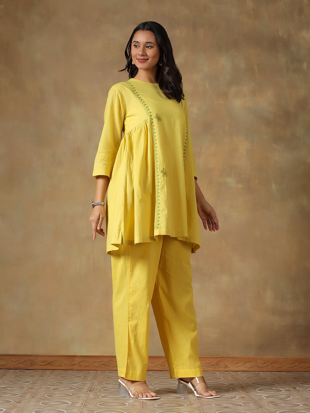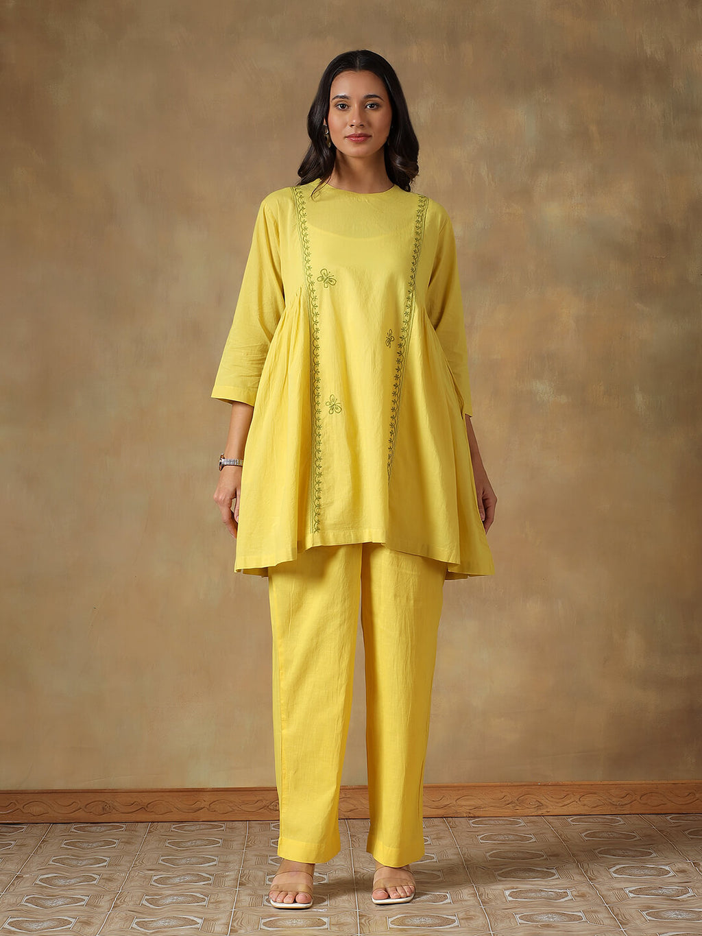 This co-ord set features a flowy cotton kurta paired with classic straight-fit pants, making it ideal for everyday wear, office dressing, travel, and summer outings. Subtle hand-embroidered Chikankari motifs enhance the kurta, adding artisanal charm while maintaining a contemporary silhouette.