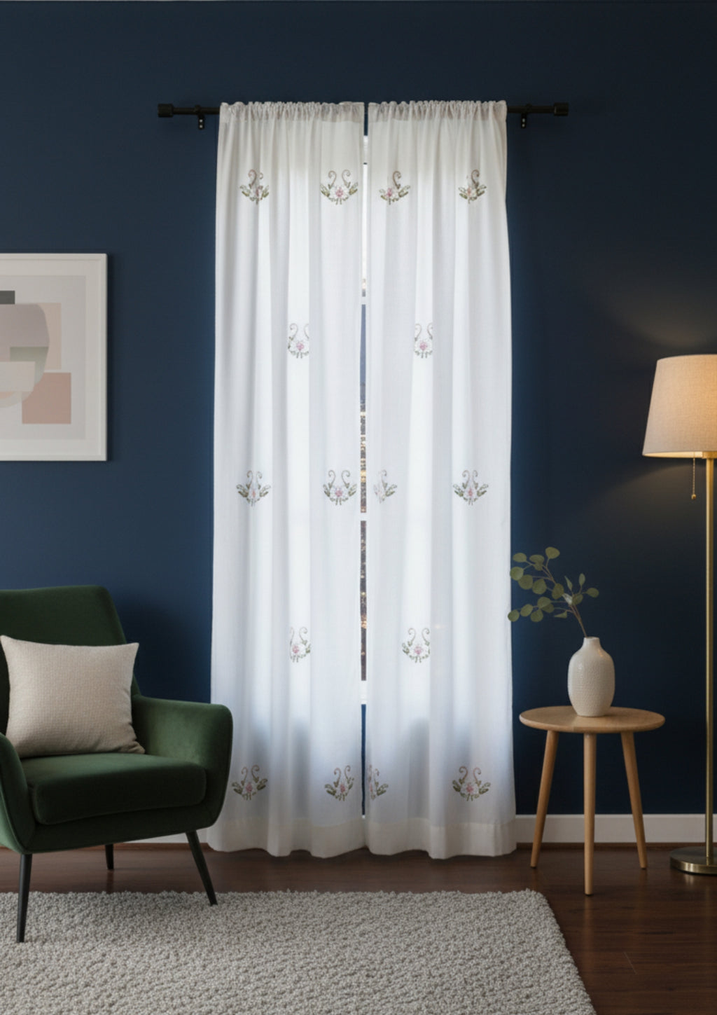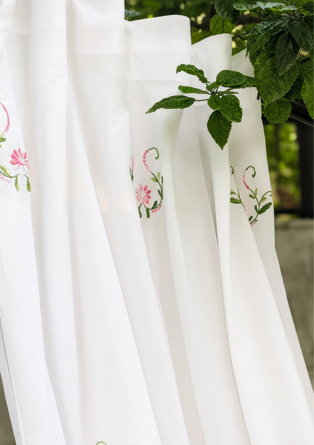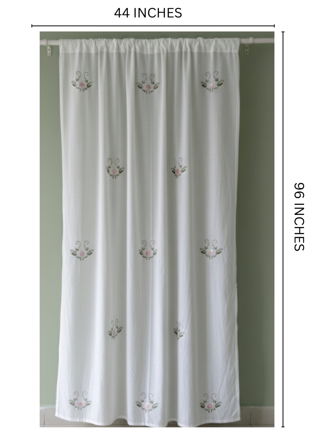 Soft, airy, and hand-embroidered with love, this cotton curtain brings a refreshing touch of artisanal embroidery to your home. Featuring delicate pink floral motifs with green leaf accents, it adds a graceful charm while allowing gentle light to filter through, creating a cozy and inviting ambience.
