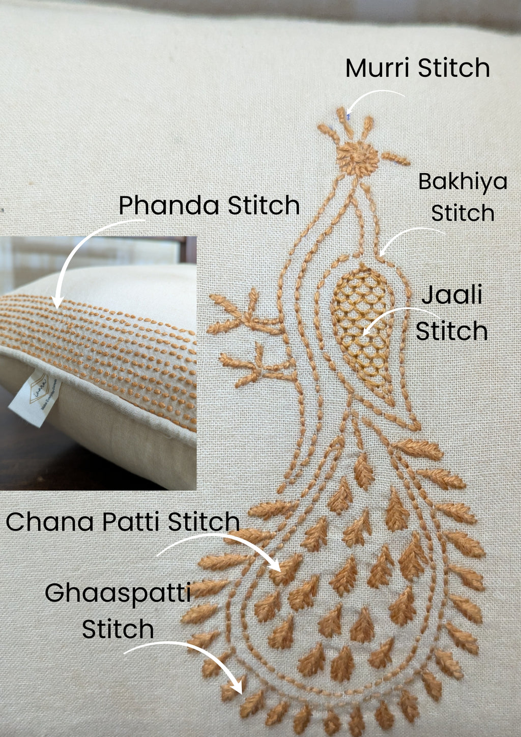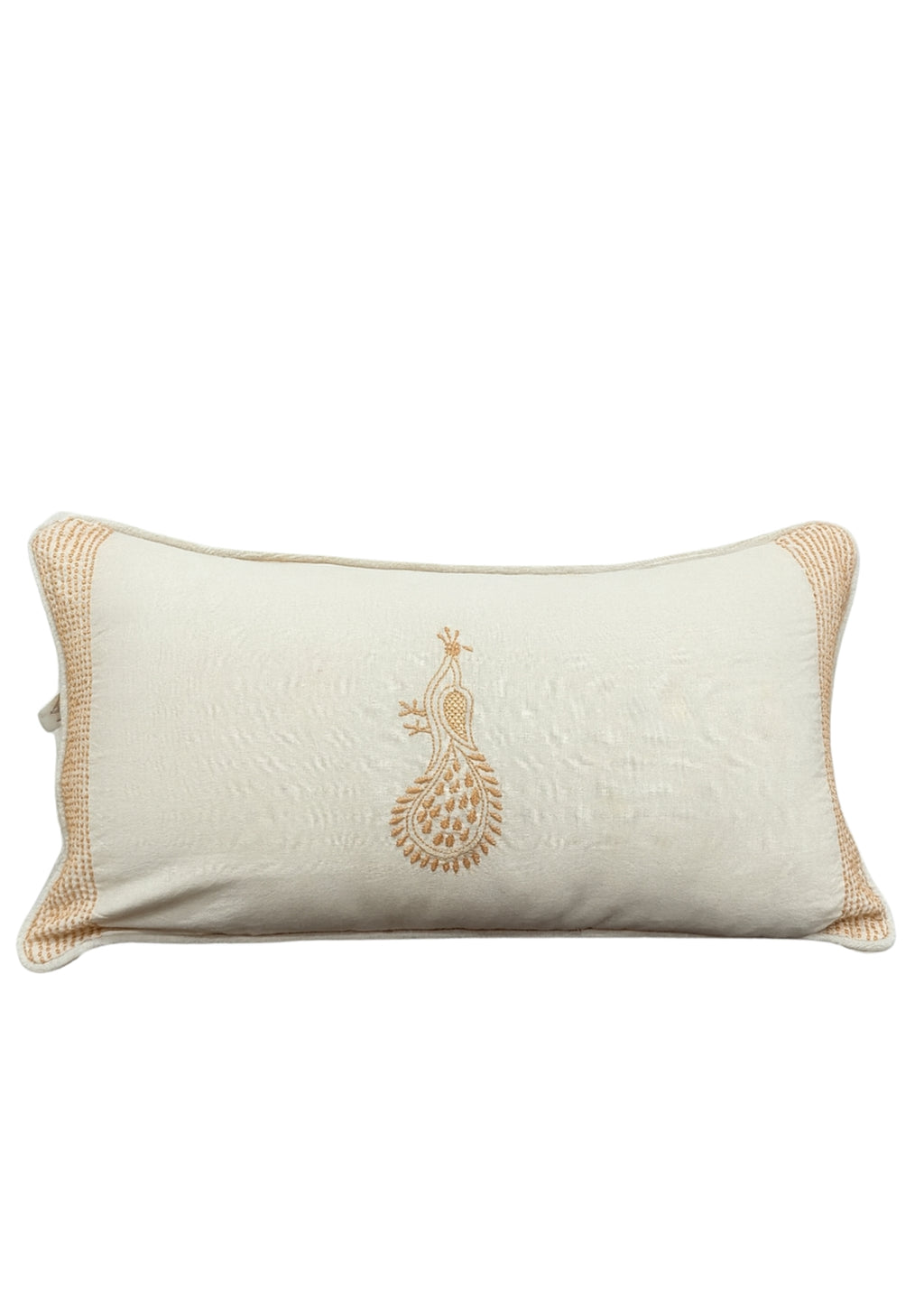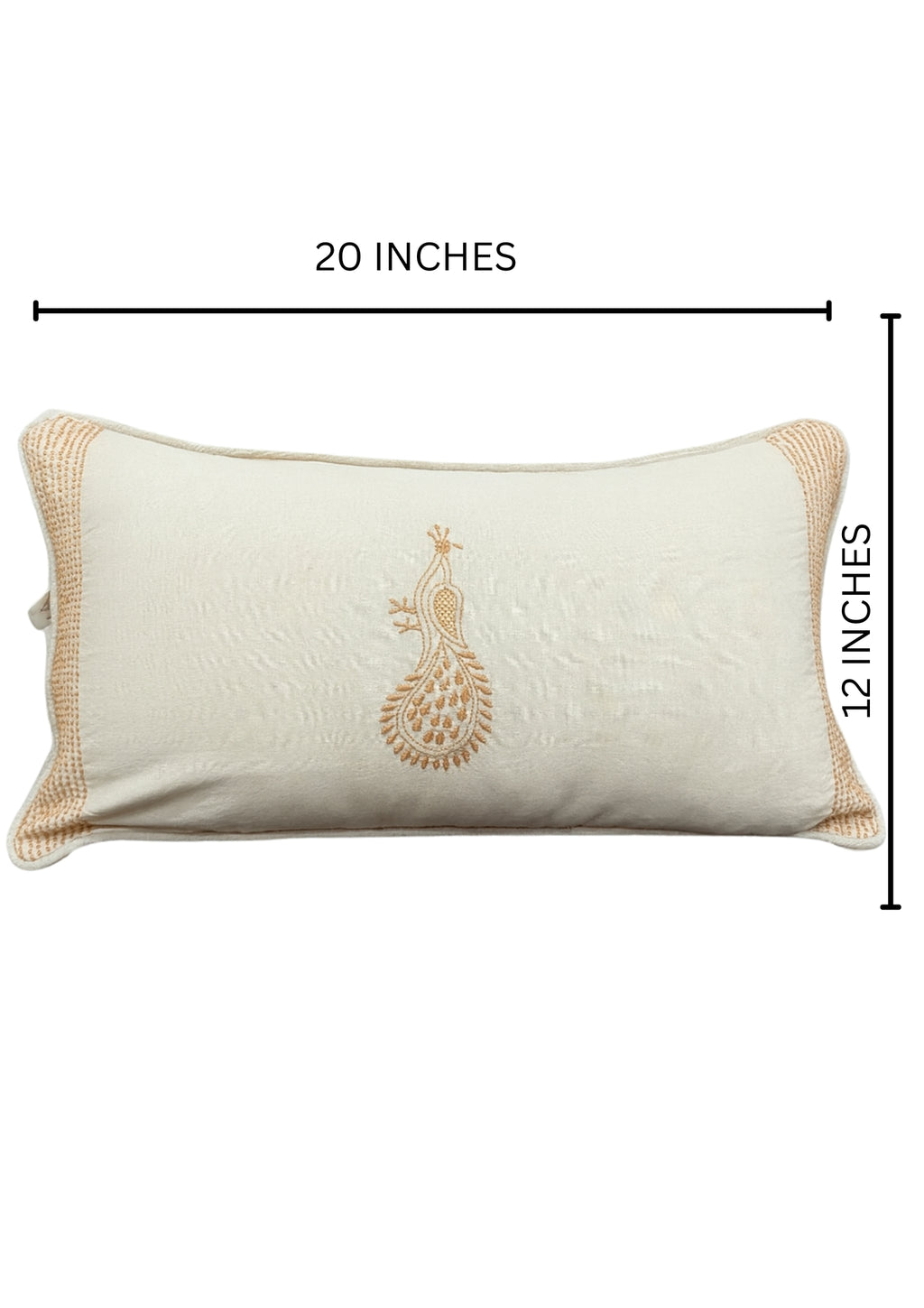 Add a touch of timeless elegance to your living space with our premium hand-embroidered Chikankari cushion cover. This stunning beige cushion cover is crafted from 100% pure cotton, offering a soft and comfortable feel. The central design features a beautiful peacock motif, meticulously hand-embroidered using the traditional Chikankari technique.