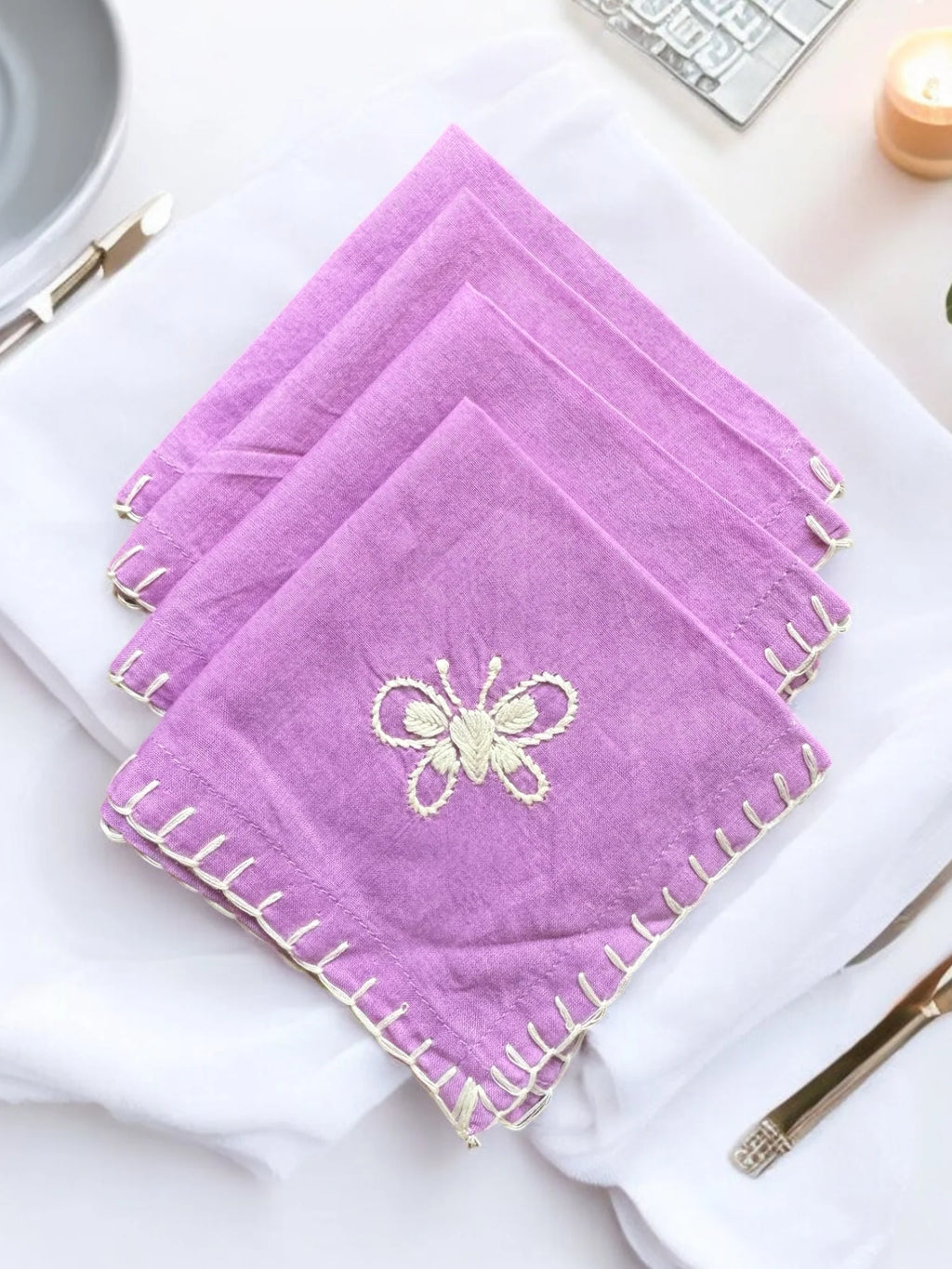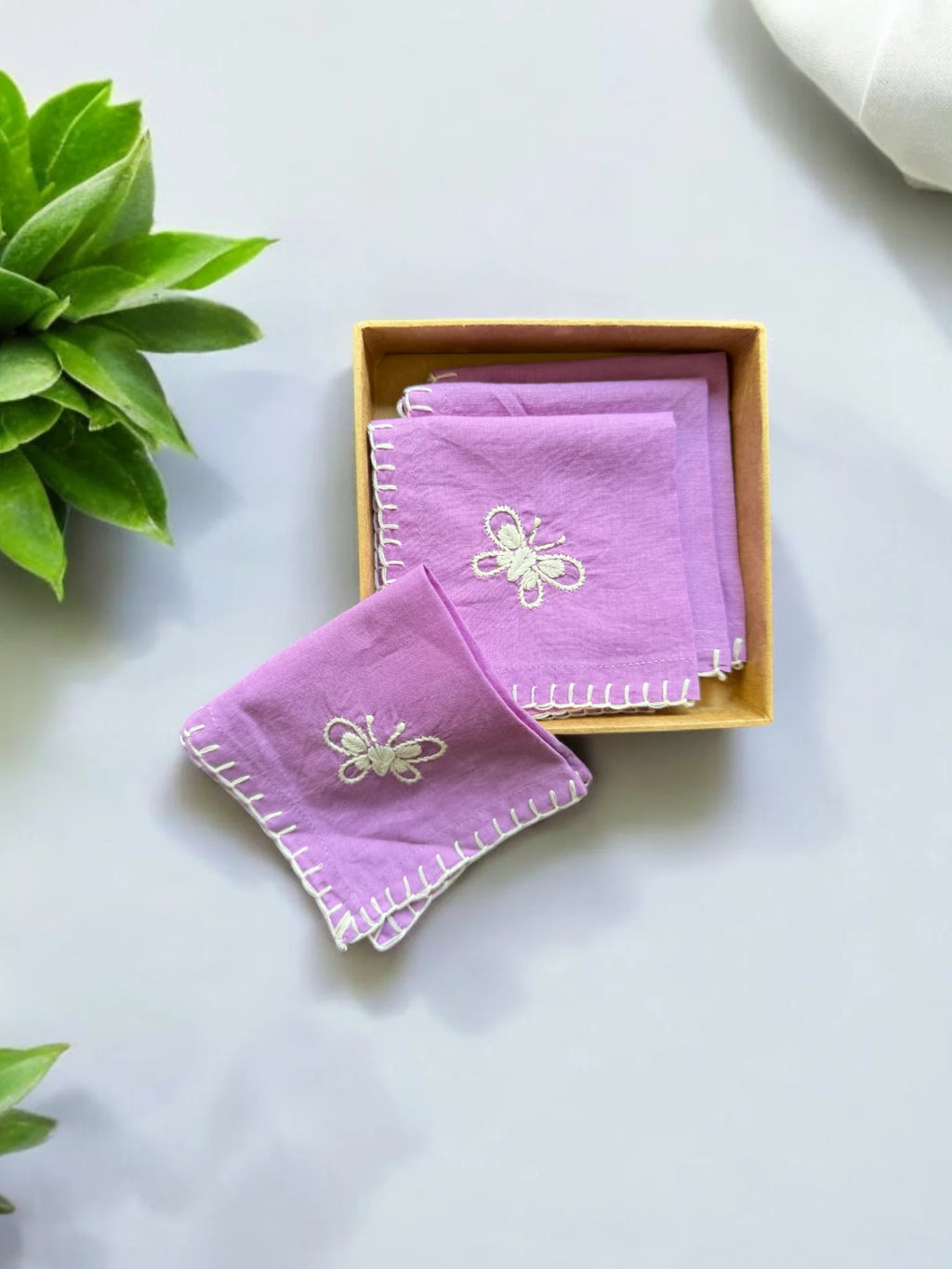Add a refined touch to your cocktail hour with the Anthophile Collection cocktail napkin. Featuring delicate Chikankari embroidery, each napkin is inspired by the anthophile's love for flowers, bringing the beauty of nature to your gatherings. These charming, handcrafted napkins are perfect for elevating intimate get-togethers or sophisticated soirees with a subtle yet elegant floral accent.